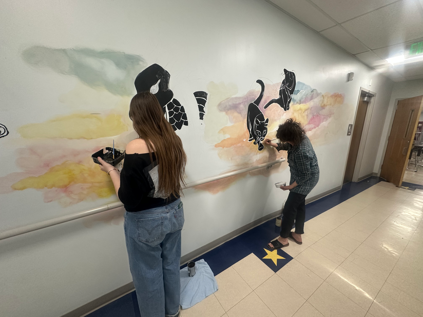 Second footage is a continuation of concepts through collective creativity-- Building on the theme of Out of Place-Out of Space, this mural is inspired by song lyrics + words of inspiration, which the students transformed into visual storytelling. ::::: They took creative direction in shaping what they wanted to paint + share, developing more skills-confidence in painting + expression— making this piece a true reflection of their voices + perspectives.